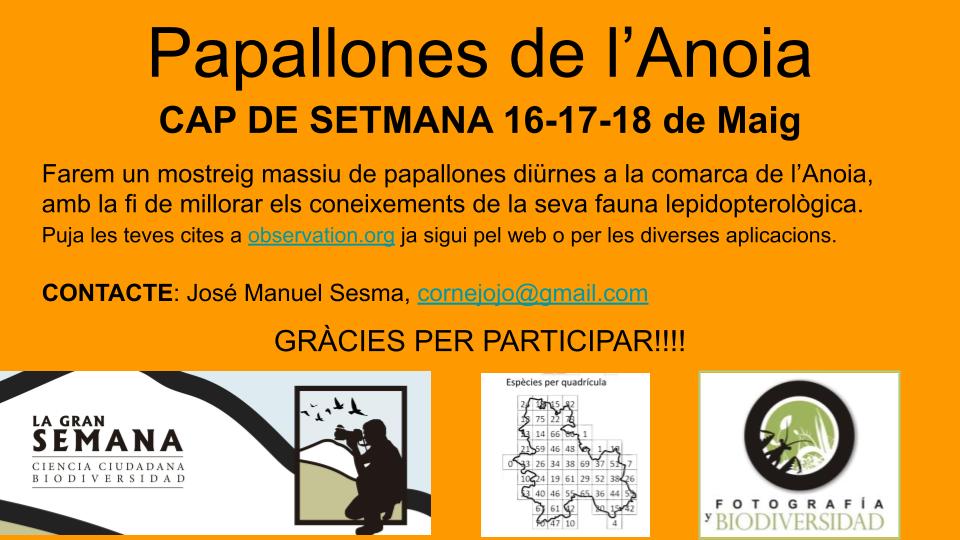 Muestreo de mariposas en la Comarca de l´Anoia. Si necesitas ayuda y más información, no dudes en contactar con José Manuel Sesma (cornejojo@gmail.com). Anímate a participar y contribuir con tus observaciones al conocimiento de nuestras mariposas durante La Gran Semana 2025.
